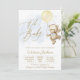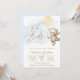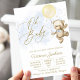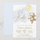 Convite de chá de bebê menino com adorável ursinho de bebê menino e balão em um fundo azul bebê e dourado. Este convite de chá de bebê menino urso balão é facilmente personalizado com os detalhes do seu evento.