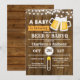 Convite de chá de bebê masculino com tema de cerveja e churrasco em fundo de madeira rústica.