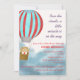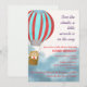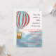 Convite de chá de bebê apresenta um ursinho fofo em um balão de ar quente voando acima das nuvens descrevendo que o bebê está chegando.