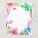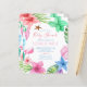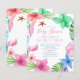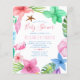 Modelo de convite de chá de bebê estilo havaiano na praia com flores de hibisco coloridas, folhas tropicais, estrela-do-mar e flamingo rosa, neutro em relação ao gênero, orçamento acessível.