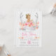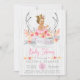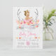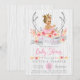 Convite de chá de bebê tribal para meninas com lindos antílopes florais rosa e dourado e faixa com uma adorável bebê loira de cabelo loiro usando uma linda coroa dourada e tutu rosa em um fundo de madeira branca rústica. Você pode personalizar facilmente este lindo convite de chá de bebê tribal boho rústico para o seu evento, simplesmente adicionando seus detalhes. Este é um design impresso sem brilho real, etc.