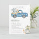 Este convite de chá de bebê adorável é a maneira perfeita de definir o tom para o seu pequeno querido. O design em aquarela apresenta um pequeno elefante fofo na parte traseira de uma clássica picape azul pintada à mão com acentos de abóboras e folhagens de outono ao seu redor,