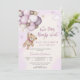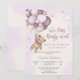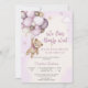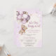Celebre seu dia especial com este adorável convite de chá de bebê com ursinho, apresentando tons pastéis de rosa e roxo, balões caprichosos, nuvens e estrelas. Perfeito para homenagear as futuras mamães, este design sonhador cria uma atmosfera alegre e acolhedora para os convidados. Personalize com seus detalhes para criar um souvenir personalizado que adiciona charme à sua celebração. Ideal para chás de bebê de meninas, este convite combina elegância e diversão para tornar seu evento inesquecível.