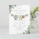 Um convite de chá de bebê menino charmoso em aquarela, apresentando folhagem de eucalipto suave e roupas de bebê adoráveis penduradas em um varal de roupas rústico. Este design elegante inclui detalhes doces de bebê, como roupas de bebê, sapatos minúsculos, mamadeira e chupeta, criando uma sensação de calor e acolhimento para celebrar um menino a caminho.