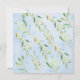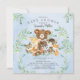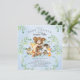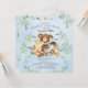 Design de chá de fraldas bonitinho com o urso mais doce sentado num toco de árvore cercado por um veado, guaxinim, esquilo, raposa, alce e raposa. Moldado com folhas de cor aquosa verde natural sobre fundo aquoso azul. Sacudir nosso convite para ver uma folha verde correspondente para um toque especial extra.