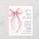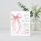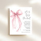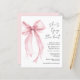 Convite de chá de noiva chic e econômico com uma aquarela de um laço coquete rosa claro, "Ela está dando o nó" em uma fonte de caligrafia moderna, e seu nome e os detalhes do evento em letras simples. Este papel semi-brilho econômico é semelhante em peso ao papel fotográfico. Uma versão maior em cartão tradicional 5x7 também está disponível (envie-nos uma mensagem para o link).