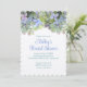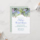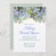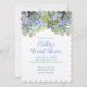 Convite de chá de noiva floral simples com linhas de texto personalizadas. Lindas flores de hortênsia no topo em tons de verde, azul e lavanda em papel branco com fonte de caligrafia elegante. Altere facilmente a redação em um grande parágrafo, incluindo informações do registro da loja. O verso é de cor verde musgo e o formato de suporte é opcional.