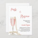 Um convite moderno, elegante e sofisticado para um Chá de Noiva Pérolas e Prosecco. Fundo branco com um copo com bolhas cor-de-rosa e pérolas. O nome é escrito com uma fonte moderna de letra manuscrita. Personalize e adicione os detalhes da sua festa.