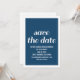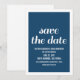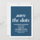 Anúncio de Charm Save the Date em azul escuro e branco com um design de tipografia caprichoso. Este convite de save the date moderno e trendy é fácil de personalizar com os detalhes do seu casamento. Para mais opções de personalização, clique no botão Personalize.