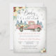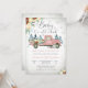Celebre com estilo com este encantador convite de chá de bebê de inverno com um caminhão rosa vintage cheio de flores e presentes. Contra um cenário de neve com árvores de pinheiro e flocos de neve delicados, combina elegância rústica com calor sazonal. Perfeito para homenagear os futuros pais, este design personalizável adiciona um toque caprichoso à sua celebração, garantindo que os convidados sintam a magia da estação.