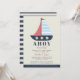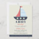 Convite de Chás de Bebê para Casais - Ahoy É um Menino - Nosso modelo de convite de chá de bebê náutico é um design moderno e náutico de chá de bebê com um veleiro com uma vela azul e branca. Ele também apresenta caligrafia manuscrita e tipografia moderna. AHOY está em letras negritas e azuis escuras. O verso do convite é listras de azul escuro e creme para combinar com a frente.