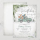Celebre a chegada do seu pequeno com este encantador convite de chá de bebê de inverno na floresta. Com um caminhão verde vintage carregando animais da floresta, balões e uma árvore de Natal, o design é acentuado com galhos de pinheiro, flocos de neve e um cenário de floresta nevada. Perfeito para chás de bebê de inverno, este cartão festivo e caprichoso combina charme rústico com elegância sazonal. Os convidados vão adorar o tema aconchegante da floresta e os detalhes encantadores que tornam este convite verdadeiramente memorável.