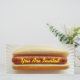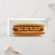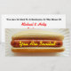 Um convite magro com uma foto de um cachorro-quente simples num pão descansando num prato de papel branco. O texto amarelo sobre o molho (mostarda) diz "Você está convidado". Personalize o texto preto e vermelho no lado oposto com seu nome e detalhes do seu evento.