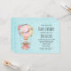 Convite de churrasco de bebê com um design adorável com uma ilustração de aquarela. Um balão de ar quente decorado com lindas flores vermelhas e rosas. Um adorável ursinho branco sentado na cesta. Fundo azul claro estilo vintage.