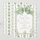 Convite de churrasco de bebê doce dinossauro com fundo verde de selva e laço de folha verde rústico amarrado com aniagem. Blocos vintage, cupcake de dinossauro e dinossauro de tricô falso acentuam a parte inferior deste convite adorável. Tão doce quanto pode ser para um evento perfeito. Neutro em termos de gênero.