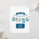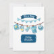 Este convite apresenta as palavras "Churrasco de Bebê É um Menino" em uma fonte de impressão única com letras brancas e fundo azul com roupas em uma linha neste tema e estilo de menino. Impresso em um papel clássico e versátil com 17,5 pt de espessura e acabamento matte não revestido com textura de casca de ovo, feito e impresso nos EUA, com "É um Menino" impresso no verso.