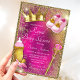 Convite de churrasco de bebê princesa rosa dourado com coisas de princesa rosa e dourado em um belo fundo rosa e dourado. Este convite de churrasco de bebê princesa real é facilmente personalizado com os detalhes do seu evento.
