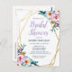 Flores suaves de aquarela boho em lavanda dentro de uma moldura geométrica dupla dourada apresentam cores de lavanda, branco e floreios botânicos e de penas. Personalize este convite de churrasco de noiva com suas próprias cores e fontes ou mantenha esta tipografia popular como está para sua conveniência.