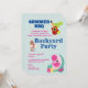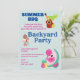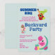 Um convite de churrasco de festa no quintal com fundo verde com bolinhas brancas. Uma ilustração de flamingo fofo com melancias e abacaxi. Margarita, violão mexicano e um limão. Alguns doces de sorvete também ilustram este convite de verão.