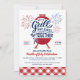 Convide amigos e familiares para uma Celebração do Dia 4 de Julho com este convite "Grill and Chill Together". O design apresenta uma ilustração clássica de churrasco com fogos de artifício e tipografia personalizada para enfatizar o churrasco e o relaxamento que acontecerão juntos! A parte inferior do convite inclui gingham xadrez vermelho clássico para picnic, para preparar o cenário para uma celebração à moda antiga!