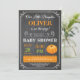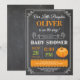 Cartão de Convite de Chuvada de Bebê Abóbora. Convite de Chuvada de Bebê de Outono. Laranja e Verde com fundo de quadro-negro. Para personalização adicional, clique no botão "Personalize" e use nossa ferramenta de design para modificar este modelo.