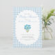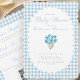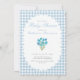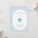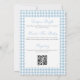 Um convite duplo lado fofo e sofisticado para o chá de bebê de um menino, apresentando xadrez azul empoeirado e um buquê de flores em aquarela azul com uma borda rendilhada. O verso tem um código QR e informações editáveis sobre os eventos da festa e a lista de presentes do bebê. Adicione o link do site da lista de presentes do bebê para editar o código QR. Perfeito para um chá de bebê elegante para dar as boas-vindas ao seu bebê menino.