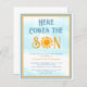 Convide familiares e amigos para a chuvada de bebê com tema solar com este convite de chuvada de bebê para menino econômico. Ele apresenta o texto "Aqui Vem o Filho" em tipografia retrô estilosa com um sol em aquarela amarela em um fundo de céu azul. Fácilmente personalizável. Como criamos nossas obras de arte, você não encontrará essa imagem exata de outros designers. Aquarela Original © Michele Davies.