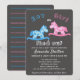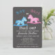 Convite de chuvada de bebê personalizável com tema de cavalo balanço fofo. Convite de cartão para descobrir se é menino ou menina. Dois cavalos balançando, um azul para um menino e um rosa para uma menina. O cartão tem fundo preto, mas você pode alterar personalizando o convite. Perfeito para convidar familiares e amigos para uma festa de revelação de gênero.