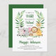 Convite de chuvada de bebê virtual fofo, brilhante e alegre com uma moldura de folhas de samambaia tropical e animais do zoológico infantil (leão, elefante, zebra, macaco e girafa) na parte inferior e "Vai Ficar Selvagem," "Chuvada de Bebê Virtual" e o nome da mãe em um script verde divertido e tipografia cinza suave manuscrita.