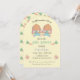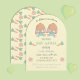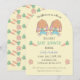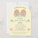 Um convite de chuvada de presentes para bebê com arco amarelo claro doce com duas coelhinhas marrons gêmeas na frente. Personalize com suas informações usando os campos do modelo. No verso, você tem um padrão feito de cenouras e pequenas flores laranjas. Perfeito para Páscoa ou primavera.