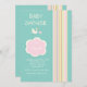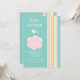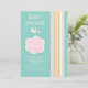 Este convite de chá de bebê com fundo azul-turquesa fofo, com uma borda de listras em cores pastéis, apresenta uma cegonha e uma nuvem rosa para o nome ou data.