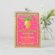 Convite de chuveiro de noiva tropical com delicioso abacaxi e flor de hibisco em um belo fundo de folha metálica rosa quente, verde lima e dourado com luzes de corda. Este convite de chuveiro de noiva de soiree luau é facilmente personalizado para o seu evento, simplesmente adicionando seus detalhes no estilo de letra e redação de sua escolha. Este é um design impresso sem folha metálica real, glitter, etc.