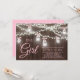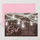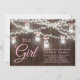 Convites de chuvinha de bebê com jarra de pedra e luzes cintilantes e jarras com laços rosa em um fundo de madeira rústica. Esses convites de chuvinha de bebê com luzes em jarra de pedra são facilmente personalizados para o seu evento, basta adicionar os detalhes. Você pode alterar a cor do fundo na parte de trás.