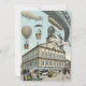 Ilustração vintage de viagem e transporte imagem futurista de ficção científica apresentando pessoas viajando por dirigíveis, balões, balões de ar quente, um trem invertido e um automóvel conversível antigo em uma cena de metrópole urbana retro de steam punk vitoriana.