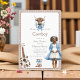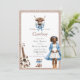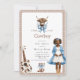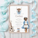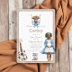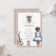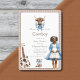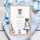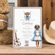 Bem-vindos ao seu pequeno cesto com este adorável convite do chá de fraldas Ocidental. Esta design mostra uma ilustração emocionante de uma mãe grávida num cardigã azul e botas de vaqueiro, ao lado de uma guitarra acústica rustica e botas de vaqueiro, todas colocadas sobre um fundo xadrez aconchegante. Os sotaques florais azuis suaves adicionam um toque de elegância gentil, criando um convite único e memorável para seu evento especial. É uma escolha ideal para os pais que procuram uma maneira única e na moda para anunciarem o seu chá de fraldas.