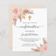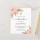 Um fundo branco chique. Decorado com flores em rosa dourado, rosas, grama dos pampas e uma cruz dourada. Personalize e adicione um nome e detalhes.