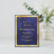 Na frente: Um cartão de convite de festas moderno e moderno para homens. Um fundo azul escuro, azul marinho. A cor azul é irregular. Com um falso quadro de ouro e um confete de ouro, letras coloridas de ouro. Modelos para informações sobre a sua parte. Fundo branco.
