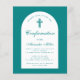 Um convite de confirmação moderno para um menino. Em um fundo azul turquesa, há um arco branco com texto turquesa dentro. A ocasião e o nome são escritos em caligrafia elegante; a primeira linha é um texto curvo.