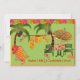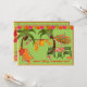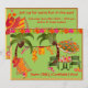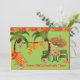 Convite de festa na piscina de coquetéis de churrasco adulto verde tropical, amarelo e laranja com cadeiras de praia, maiôs pendurados entre duas palmeiras, chinelos e copos de coquetel completos com guarda-chuvas!
