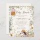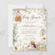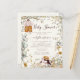 Convite de chá de bebê Cream Vintage Bunny Boy. Uma alternativa menor de 4,5” x 5,6” econômica. Disponível em papel cartão de 110 lb SEMI BRILHANTE ou em papel de 80 lb de acabamento SEDA. Envelopes são opcionais. Este design em estilo vintage tem um coelhinho usando um chapéu espiando de trás de flores e folhagens no canto inferior direito, e uma roupinha de bebê menino pendurada num galho de árvore no topo, sobre um fundo creme. Você pode personalizar facilmente todo o texto de acordo com suas necessidades. Um fundo colorido coordenado está no verso. Você também pode alterar as fontes e as cores do texto, se desejar, através da opção "Clique para personalizar ainda mais", bem como as cores de fundo de ambos os lados.
