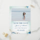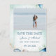 Convite de data de casamento moderno com caligrafia em aquarela com conchas, estrelas-do-mar, algas marinhas. Fundo de aquarela azul-teal. Combinação de fontes elegantes. Perfeito para casamento na praia ou com estilo náutico.