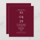 Um design moderno minimalista de convite de casamento econômico com a data especial e detalhes do casamento em tipografia clássica e sofisticada em um fundo borgonha. Criado por Thisisnotme©