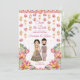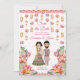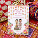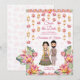 Modelo de convite de data de casamento indiano com flores de lótus rosa, lanternas marroquinas e casal de noivos indianos.