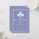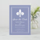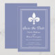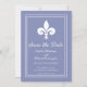 Convite de casamento elegante e simples para salvar a data, apresentando uma flor-de-lis contra um fundo Periwinkle. Este design é uma escolha única para anunciar um casamento moderno. Fácil de personalizar com os detalhes do seu casamento. Clique em "Personalizar" para encontrar mais opções de personalização.