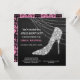 Este convite de despedida de solteira elegante apresenta um sapato de salto alto com strass ou diamante falso prateado em um fundo preto dramático. Atrás do sapato há uma sequência de luzes cintilantes. Seu texto personalizado está em branco e rosa à esquerda e na parte inferior. A parte de trás do convite tem um padrão de damasco preto antigo sobre rosa combinando. Uma combinação de charme vintage e elegância moderna!