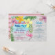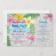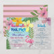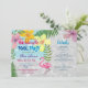 Convite de despedida de solteira na piscina moderno e divertido com flamingo fofo, itinerário personalizado e flores coloridas em aquarela, e folhas de palmeira.
