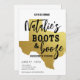 Faça os sonhos de Despedida de Solteira no Texas da sua amiga se tornarem realidade com este fabuloso Convite de Despedida de Solteira Boots & Booze Texas. Coloque o foco na sortuda com seu design glamoroso preto e dourado e mapa dourado do Texas, pronta para ela chutar os coturnos e se divertir!