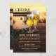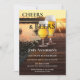 Convite de despedida de solteiro com um pôr do sol em um lago com dois copos de cerveja em um píer. No verso, você pode escolher se deseja exibir um fundo de madeira escura ou uma imagem maior dos copos. Lindos para uma celebração ao ar livre, pub crawl ou um churrasco.