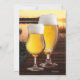Convite de despedida de solteiro com um pôr do sol em um lago com dois copos de cerveja em um píer. No verso, você pode escolher se deseja exibir um fundo de madeira escura ou uma imagem maior dos copos. Lindos para uma celebração ao ar livre, pub crawl ou um churrasco.