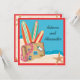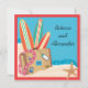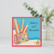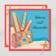 Você se casou em particular e agora quer celebrar seu casamento com amigos e familiares. Então isso pode ser o que você precisa. Bagagem com adesivos de viagem, lei e pranchas de surf em uma praia arenosa e o verso para as informações da sua festa com estrelas-do-mar espalhadas. Brilhante e colorido para aquela recepção pós-casamento ou de destino na praia. Ilustração desenhada à mão por McBooboo.